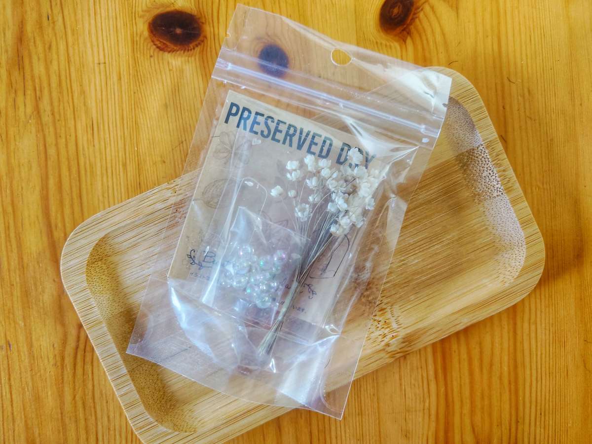 こちらはドライフラワーとプラスティックビーズのセットです。