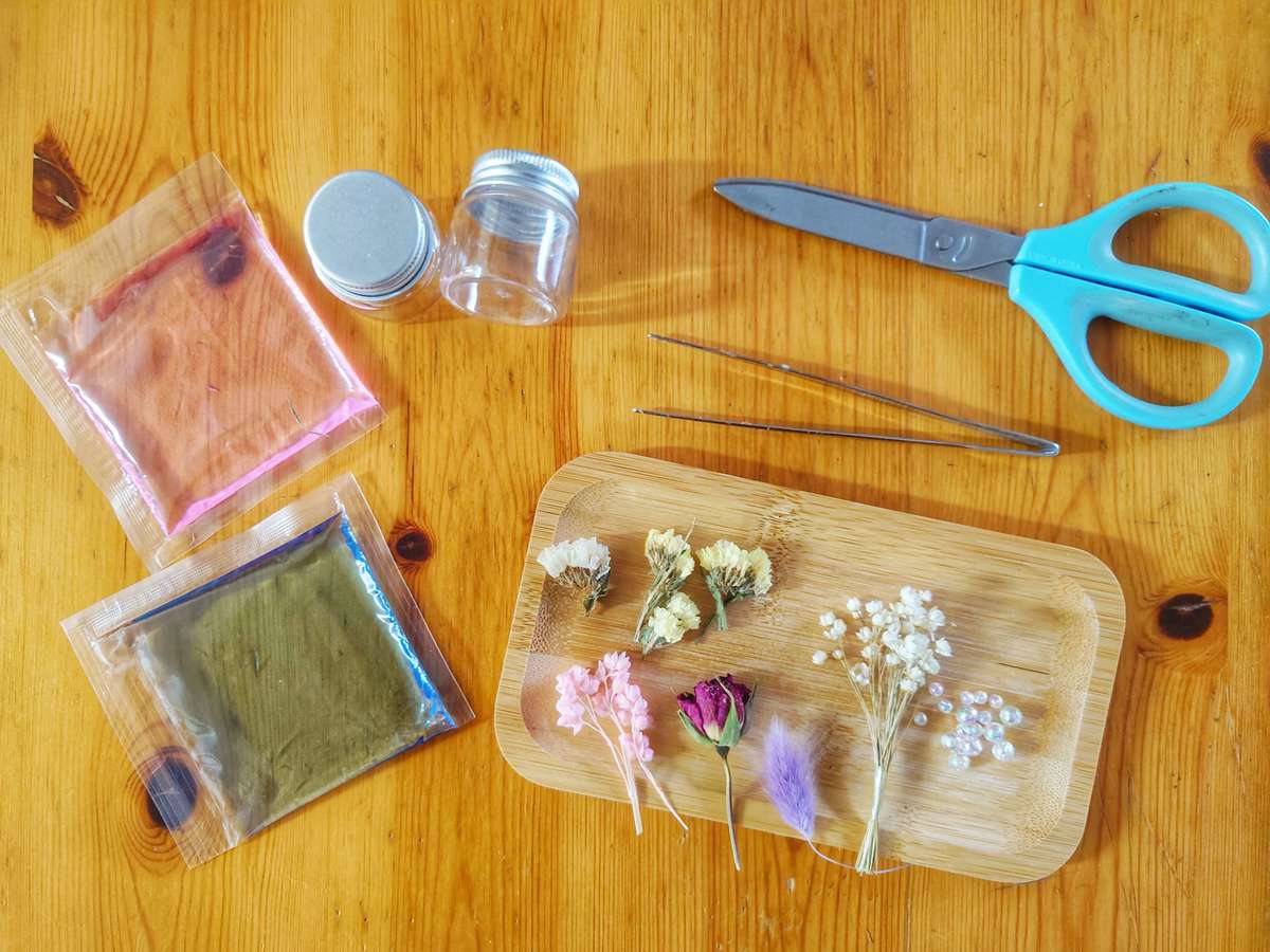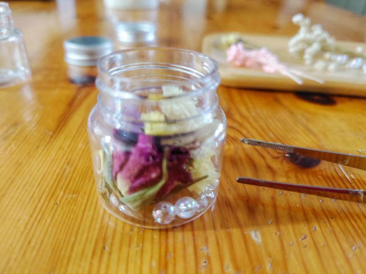 ビーズ、ドライフラワーやオイルを選んで、ハサミとピンセットを用意したら制作開始です!
