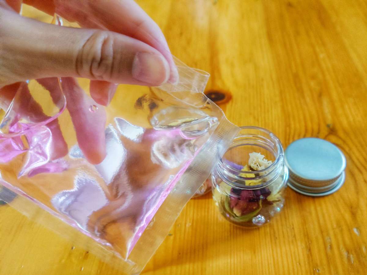 ドライフラワーはハサミでカットして容器のサイズに合わせました。