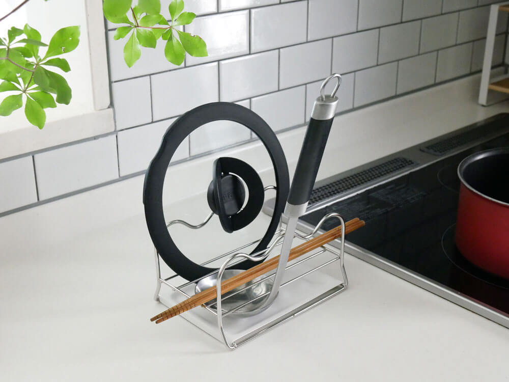 お玉や鍋蓋が感覚的にサッと置けてサッと使える「マルチスタンド」。波々ワイヤーにツールがフィットして転がり防止に!シンプルに見えて、細かいところまで計算されたスタンドで、毎日のお料理が流れるように進んじゃいます♪