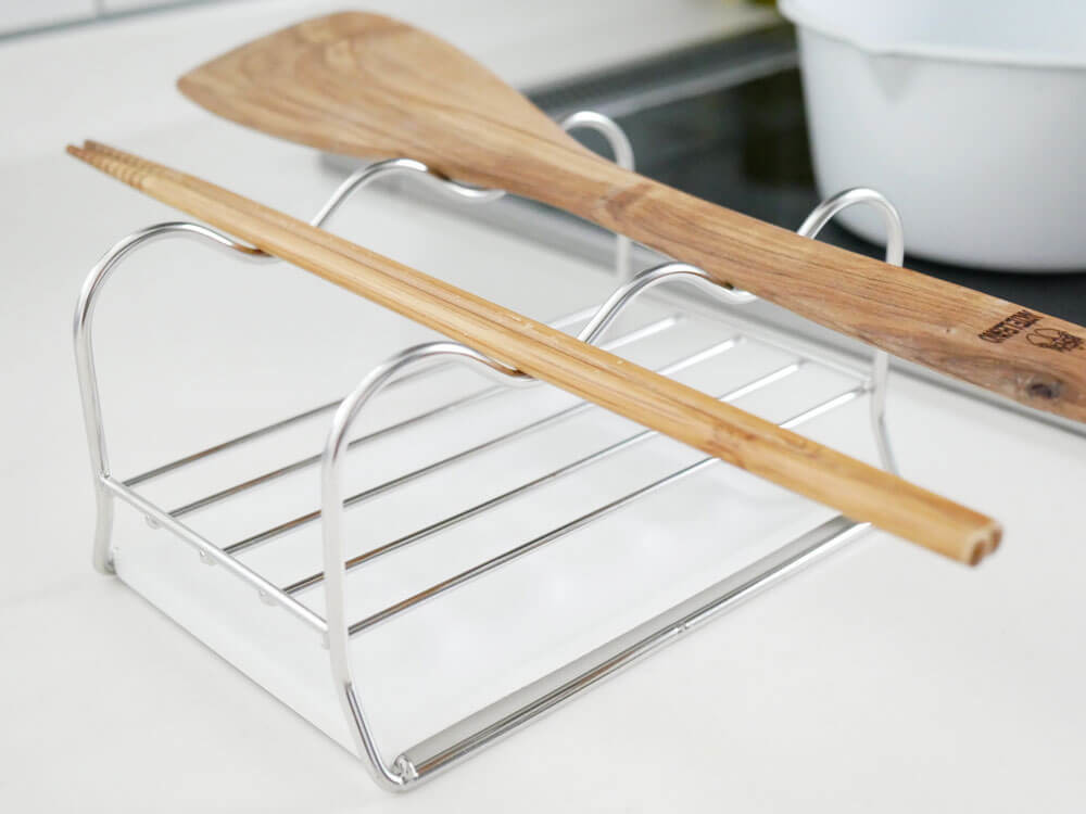 トレイだけでなく、ツールを置くスタンドも「なみなみ」。 お味噌汁用に使う菜箸、炒め物に使う菜箸とお互いが触れずに置けるのが嬉しいですね。