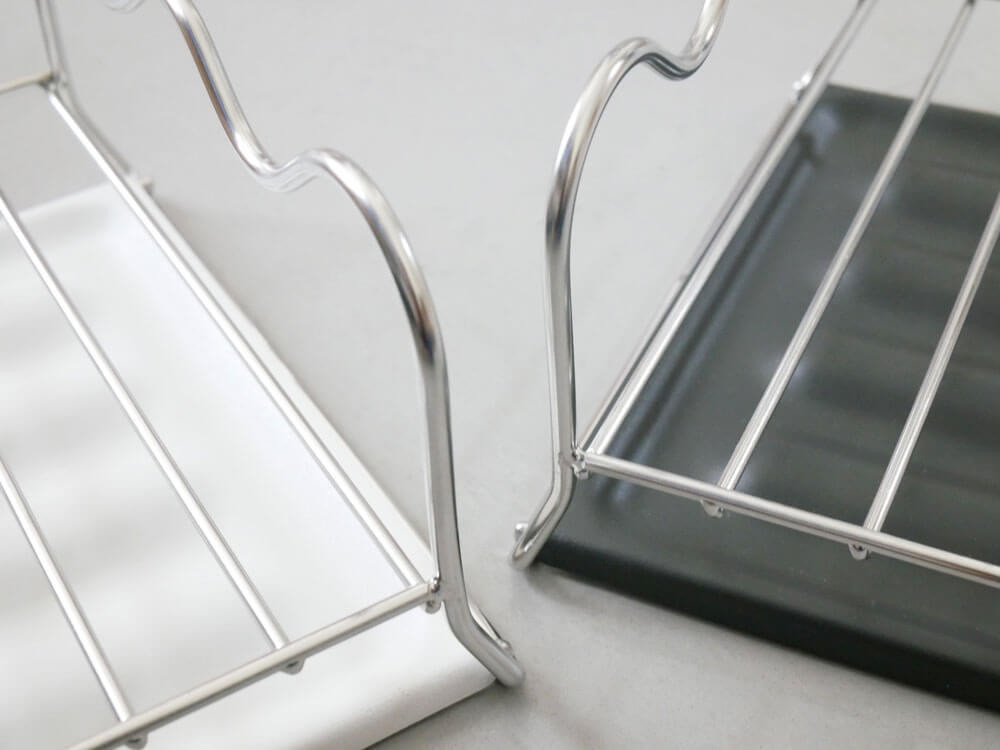 錆に強いステンレス素材にさらに耐水性や防錆効果が高い「エポキシ樹脂粉体塗装」を施してあるので、キッチンで安心してお使いいただけますよ。
