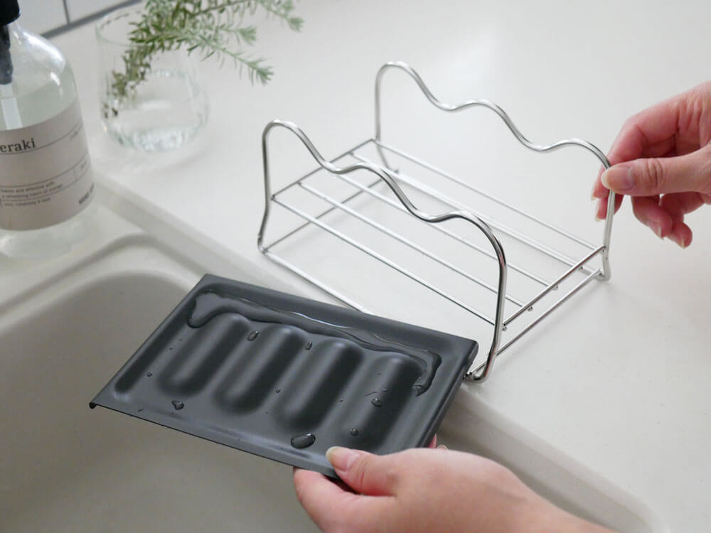 お手入れは、食器用洗剤で洗って水気をきれいに拭き取ってください。トレイの端面は、直接手で触ると怪我をする恐れがありますので、スポンジを介在して洗ってください。