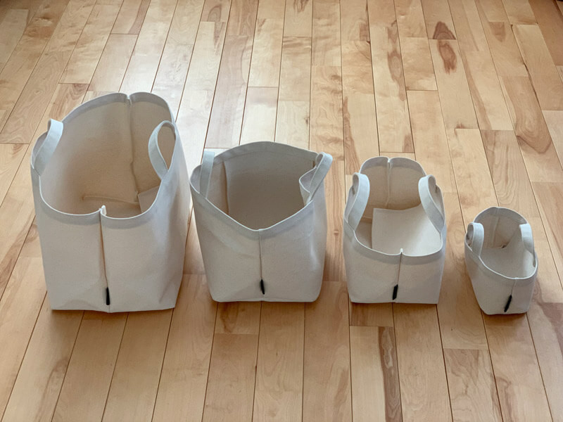 「目隠しできる帆布素材の収納トート」は、ナチュラル、ライトグレー、モカグレーと3色展開ですので、サイズ別で色を変えて収納すれば、視覚的にも判断がラクになります。
