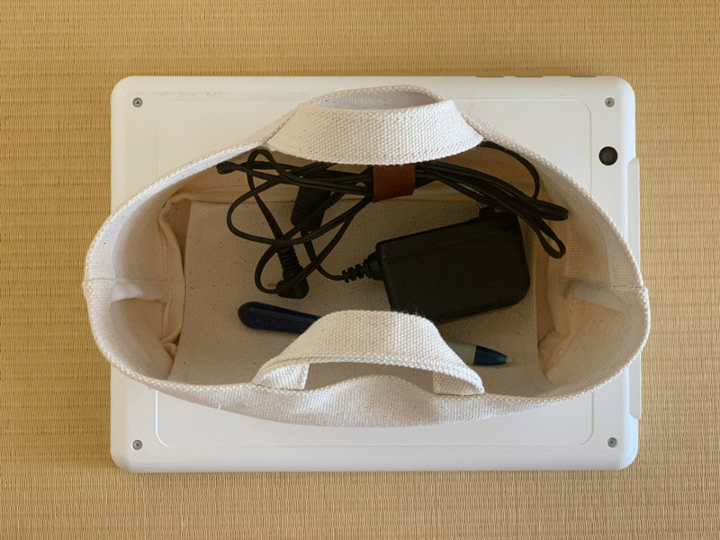 細々しがちなタッチペンと充電ケーブルをSSサイズに収納して、タブレットと一緒に、使う場所に移動できるようにしました。