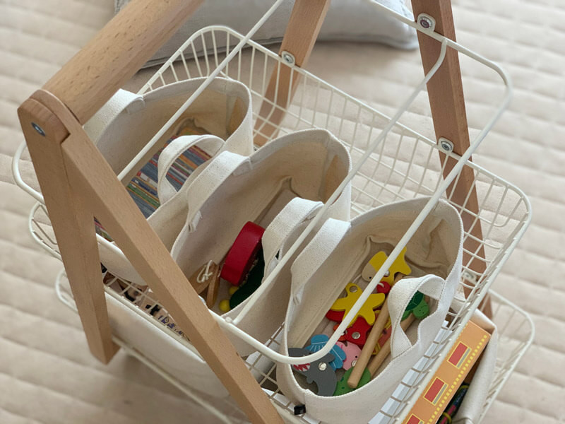 リビングとおもちゃコーナーとの、行ったり来たりの光景も、プラスチック製品の収納用品よりずっと愛くるしいのです。
