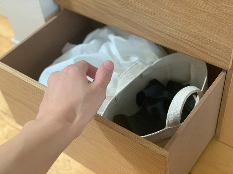 プラスチック製の仕切りだと、引き出しにフィットしすぎて中身だけ取り出すようになるのですが、トート収納ならひとまとめに持ち出せますよね。