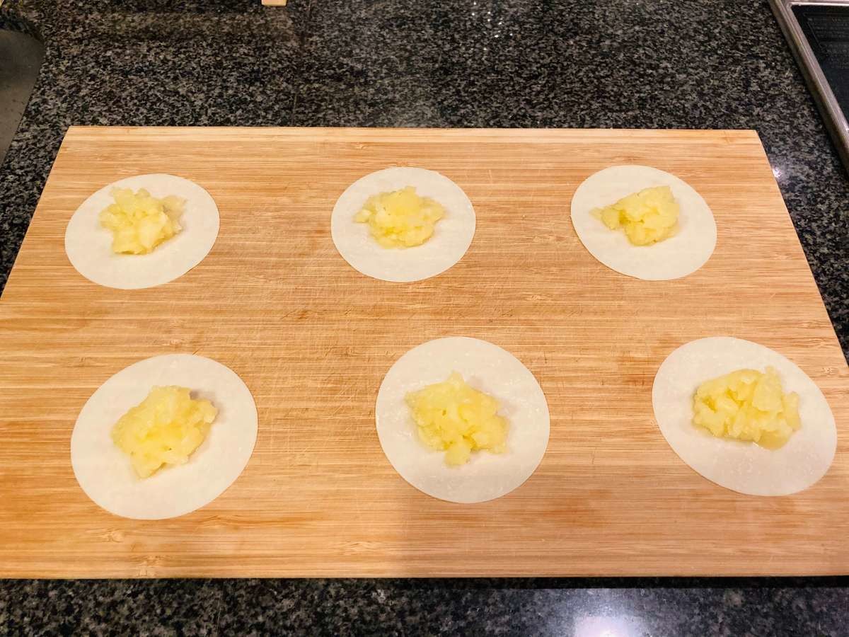 ③よくかき混ぜ、なるべく汁が入らないように餃子の皮(1枚)の中心に小さじ2をのせ、皮の端に水をつけて半分に折りたたむ。