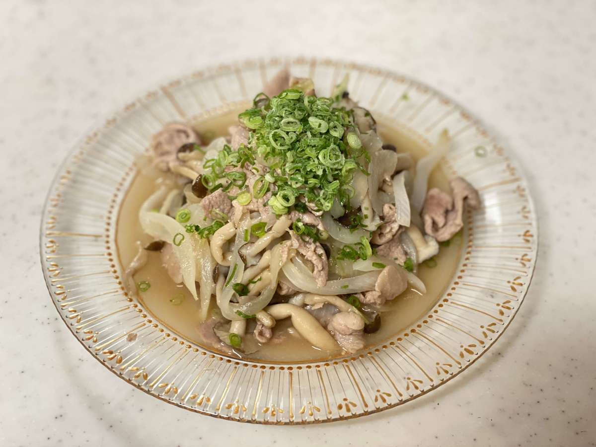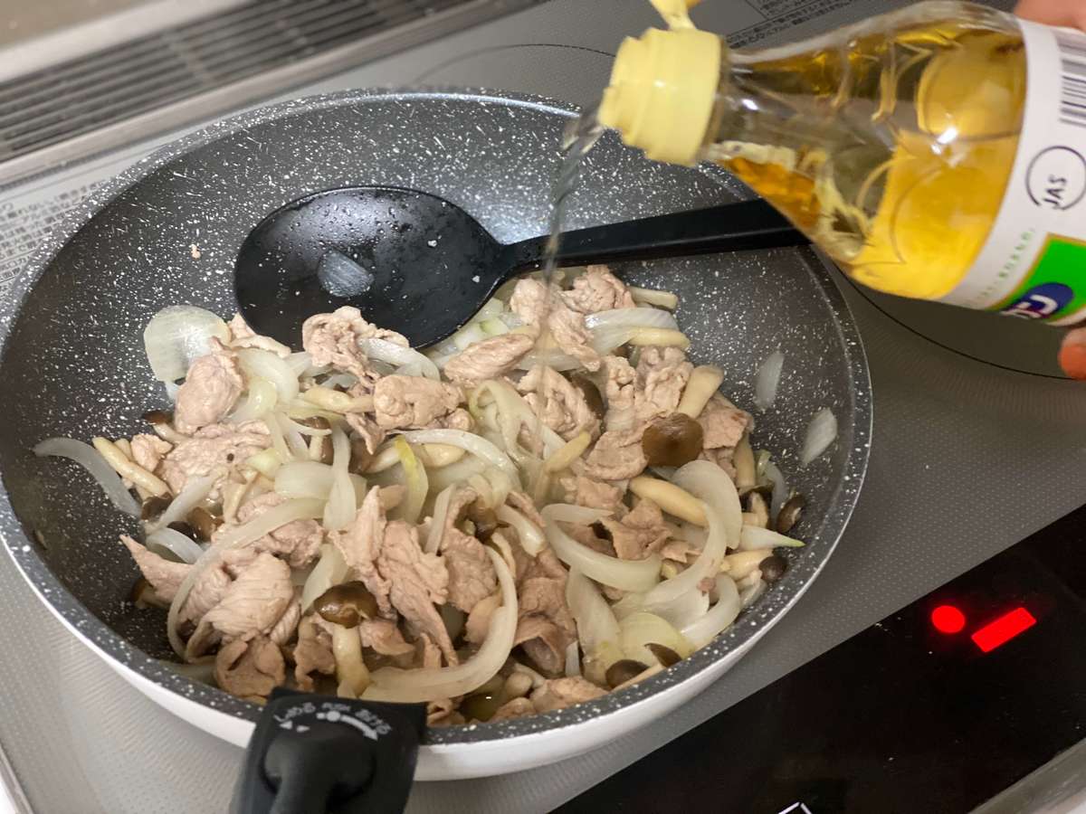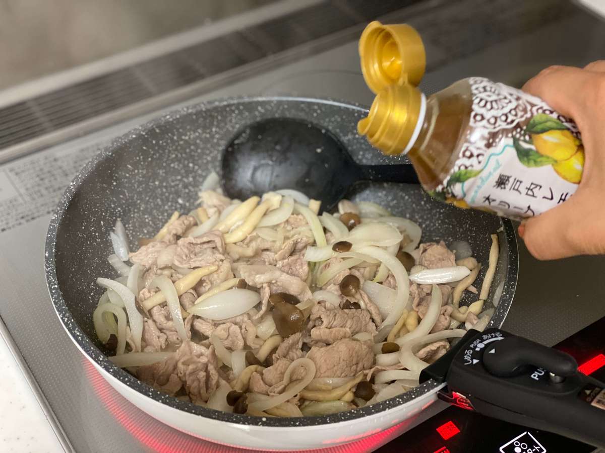 玉ねぎ、豚肉、しめじを炒めます。火が通ったら、「瀬戸内レモンオリーブオイルつゆ」をいれてサッと混ぜます。
