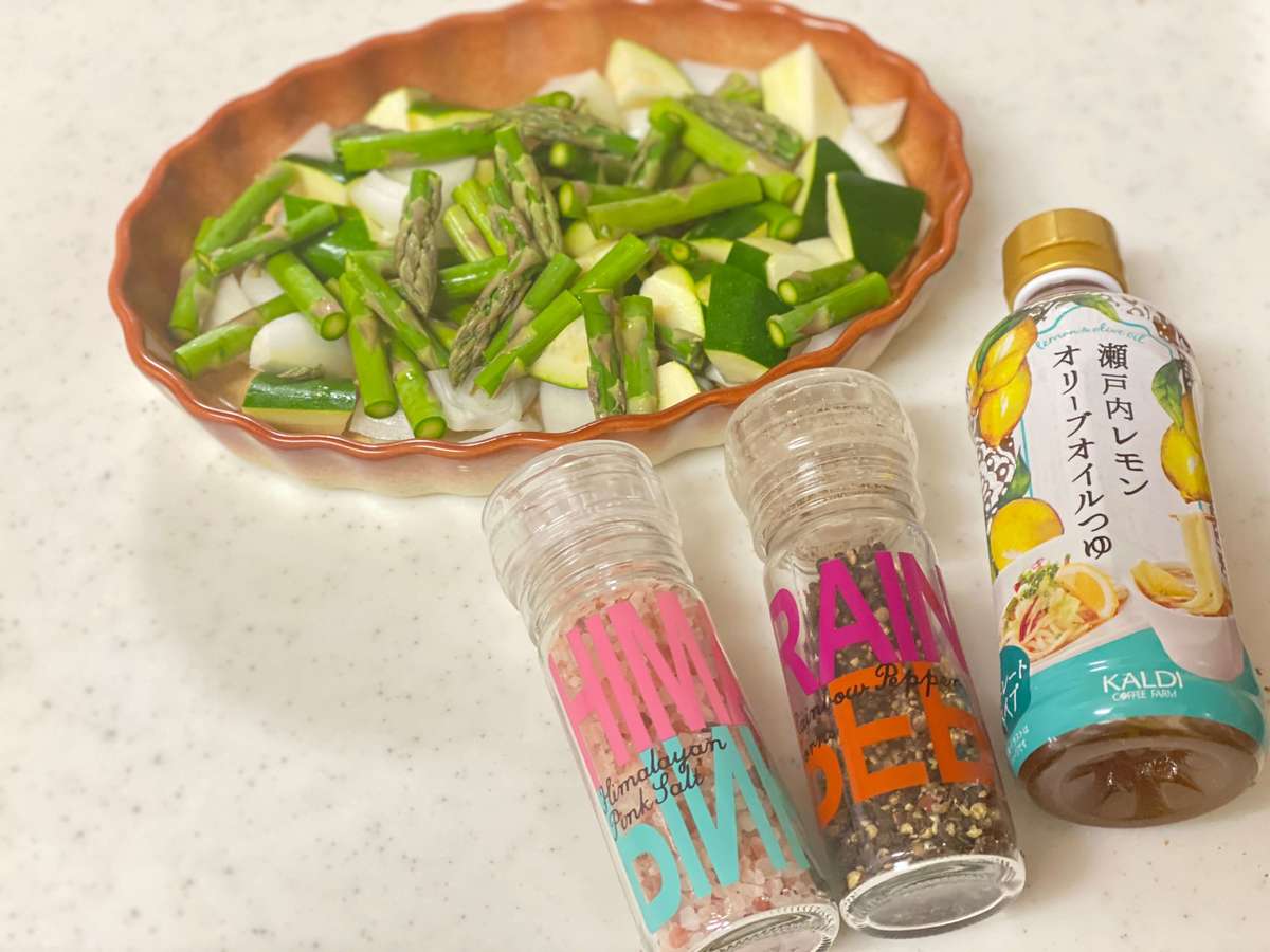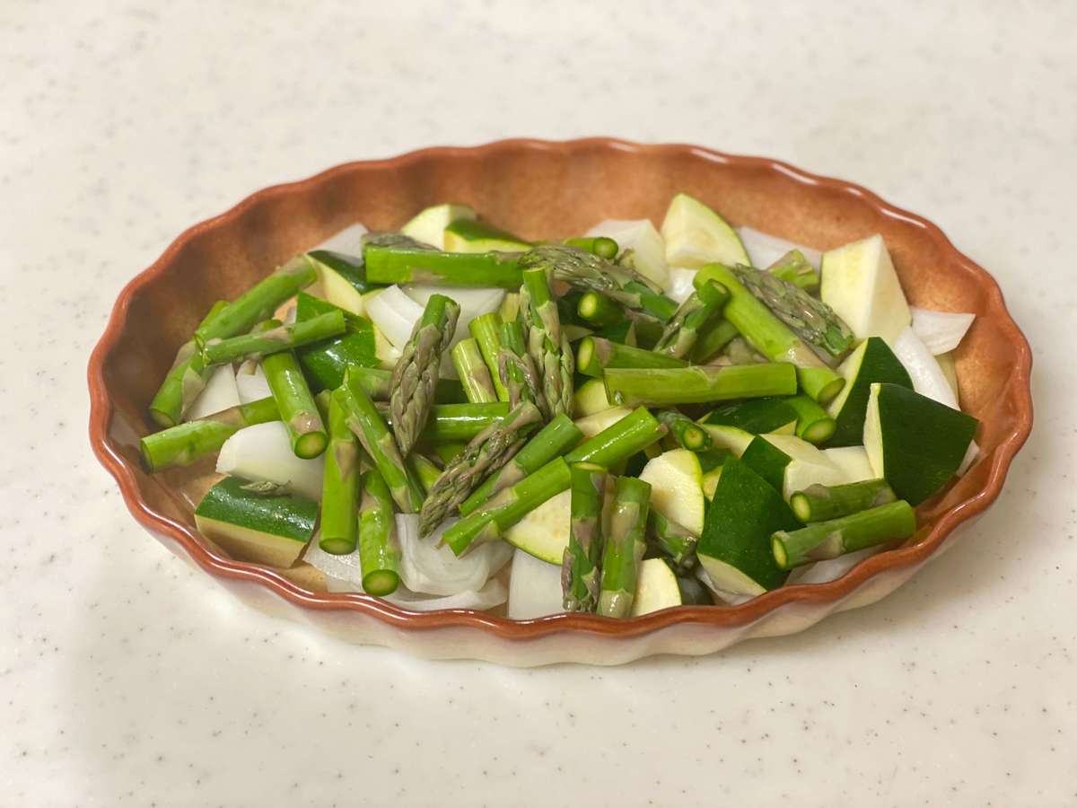 耐熱皿に食べやすい大きさに切った野菜を入れます。今回は、玉ねぎ、ズッキーニ、アスパラガスを入れました。