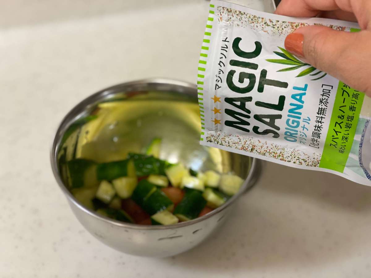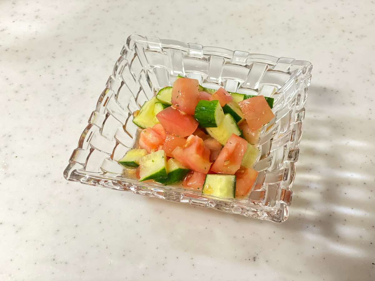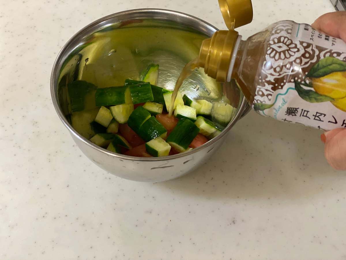 きゅうり、トマトをさいの目に切ります。「瀬戸内レモンオリーブオイルつゆ」とハーブソルトをかけて、20分ほど置けばあっという間にマリネの完成です。