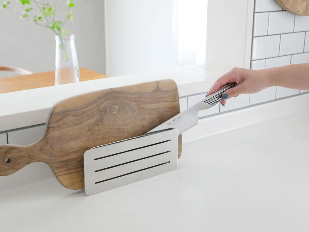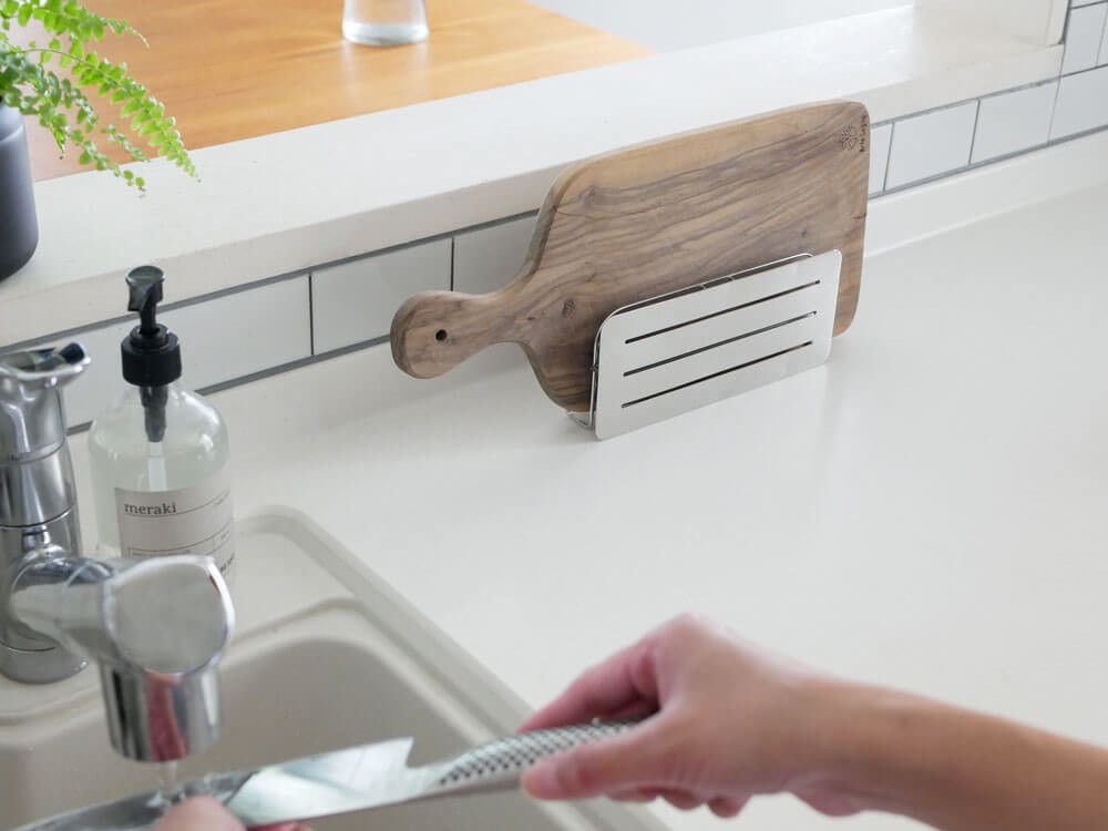 「包丁&まな板スタンド」は、そんな毎日使うキッチンツールをスマートに収納できるスタンド。手狭なスペースに場所を取らずに置け、使用する際もすぐに取れるので楽ちん。