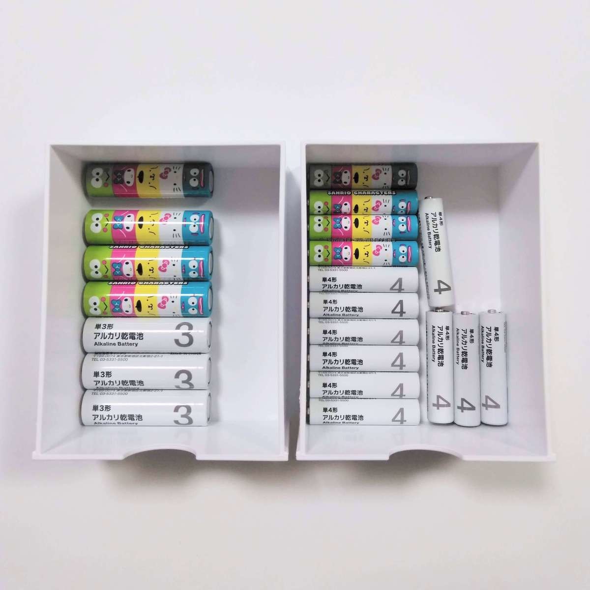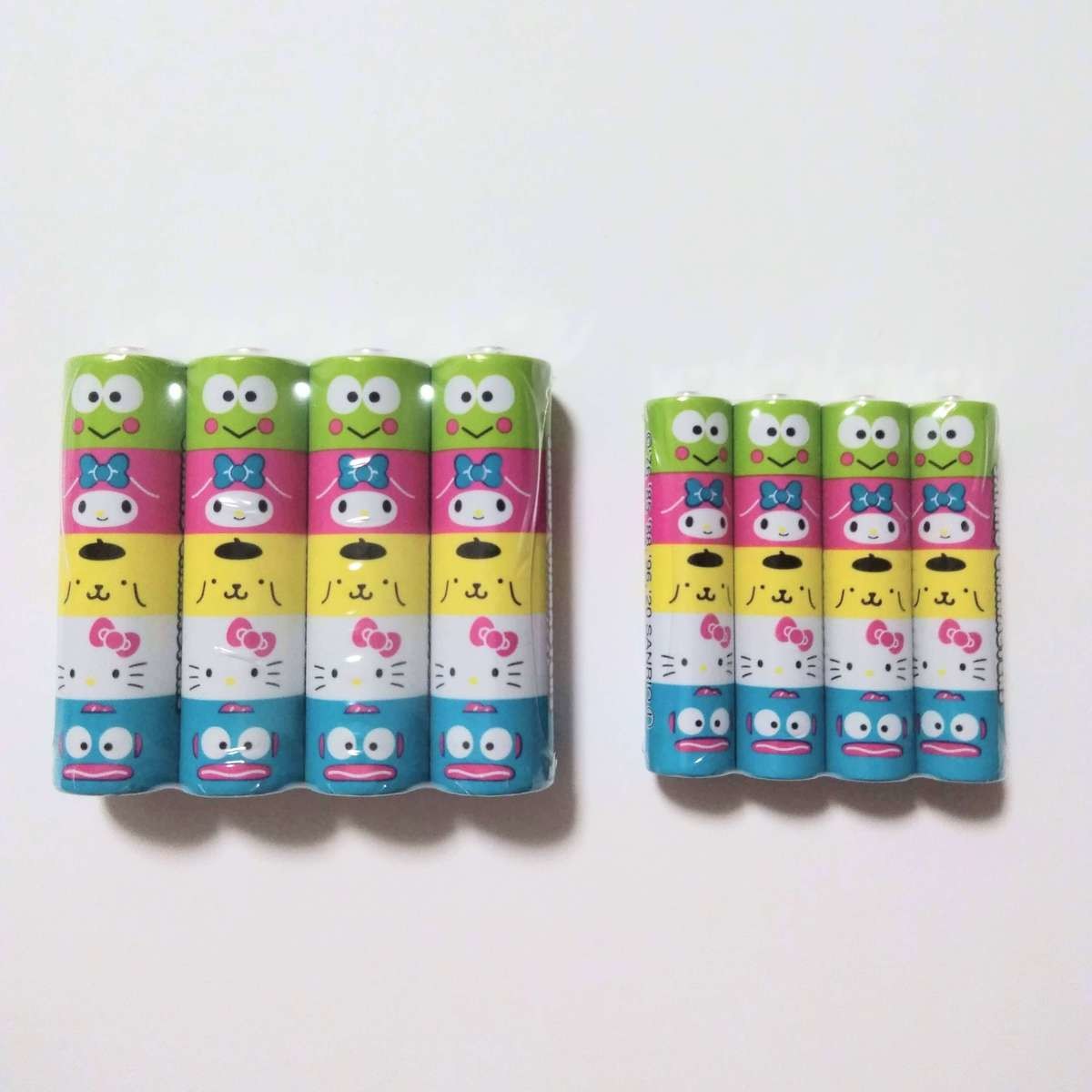 何かと使う機会の多い乾電池も、キャラクターグッズに!けろけろけろっぴ、マイメロディ、ポムポムプリン、ハローキティ、ハンギョドンがプリントされています。