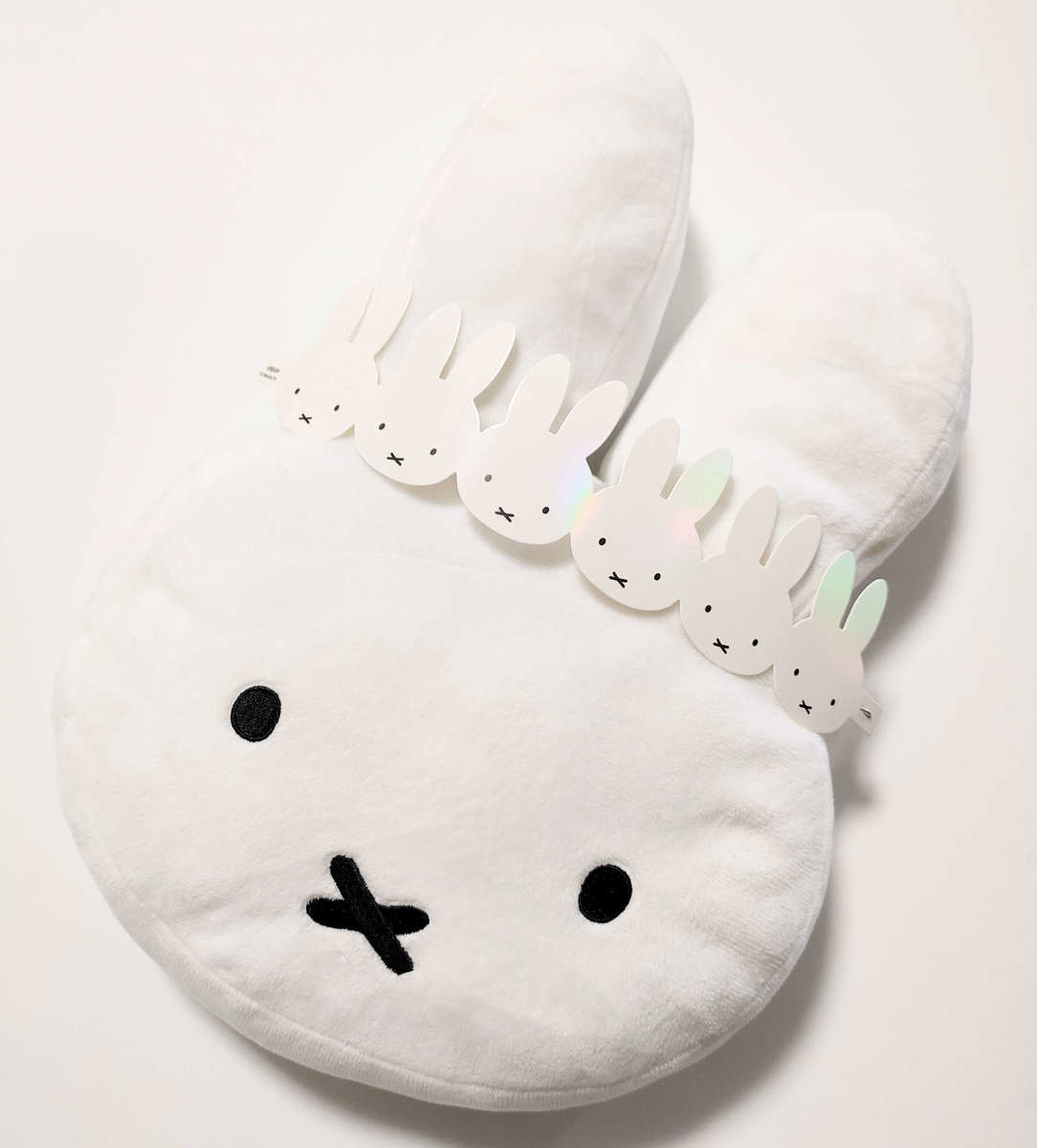 後ろにゴムがついていて、頭に装着できるようになっています。早速、我が家にあるミッフィークッションにつけてみました♪