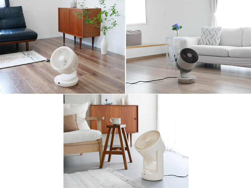 まず、最初にご紹介するのは、空気を循環し室内の温度を均一に保つサーキュレーターから。優しく広がる風で直接肌に当てる扇風機とは異なり、直線的に強めの風を起こし、部屋の空気を変えてくれるのでエアコンで生じる“温度ムラ”を無くしてくれるんです。