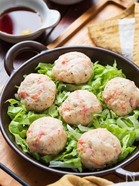 鶏ひき肉と玉ねぎにカニカマを加えてふんわりまるめた、大人気おかずレシピ。レンジ加熱で簡単に作れて食べ応えもあるので、暑くてコンロを使いたくない日におすすめです。お弁当用に作り置き保存も可能。