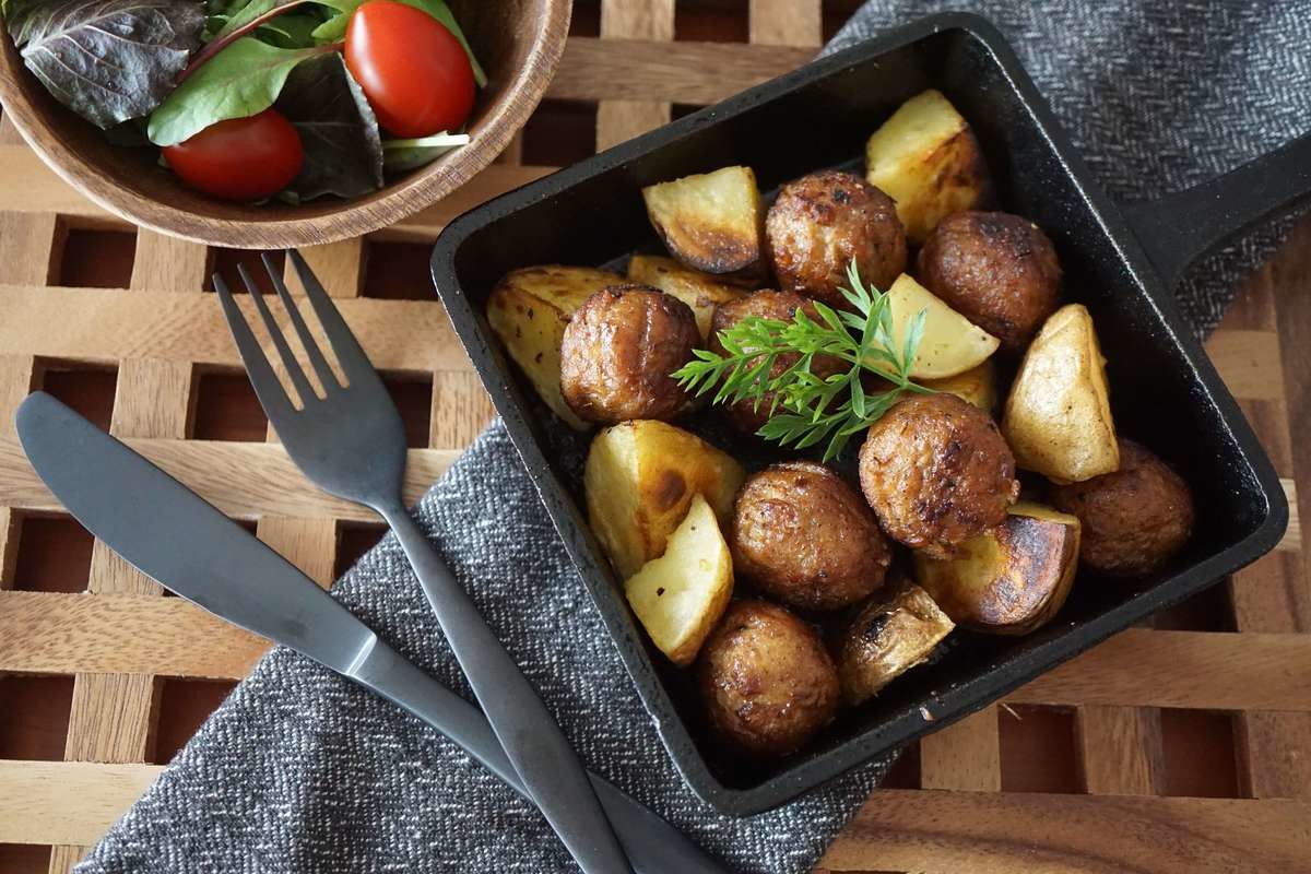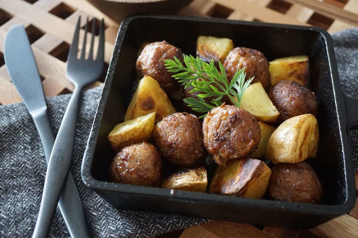 見た目はミートボールそのものですが、原材料はえんどう豆蛋白、植物油、ジャガイモ、タマネギ、えん麦ふすま、米粉、キノコ濃縮物、乾燥リンゴ、トマト粉末、ブラックペッパー、オールスパイスなどで、動物性成分は一切含まれていません。
