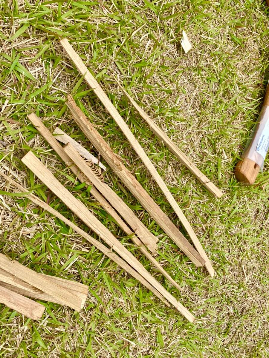 たき火の「焚き付け」に使う木を作りました。着火力を高めるためにできるだけ細い木が必要なので、できるだけ、こまかく割っていきます。