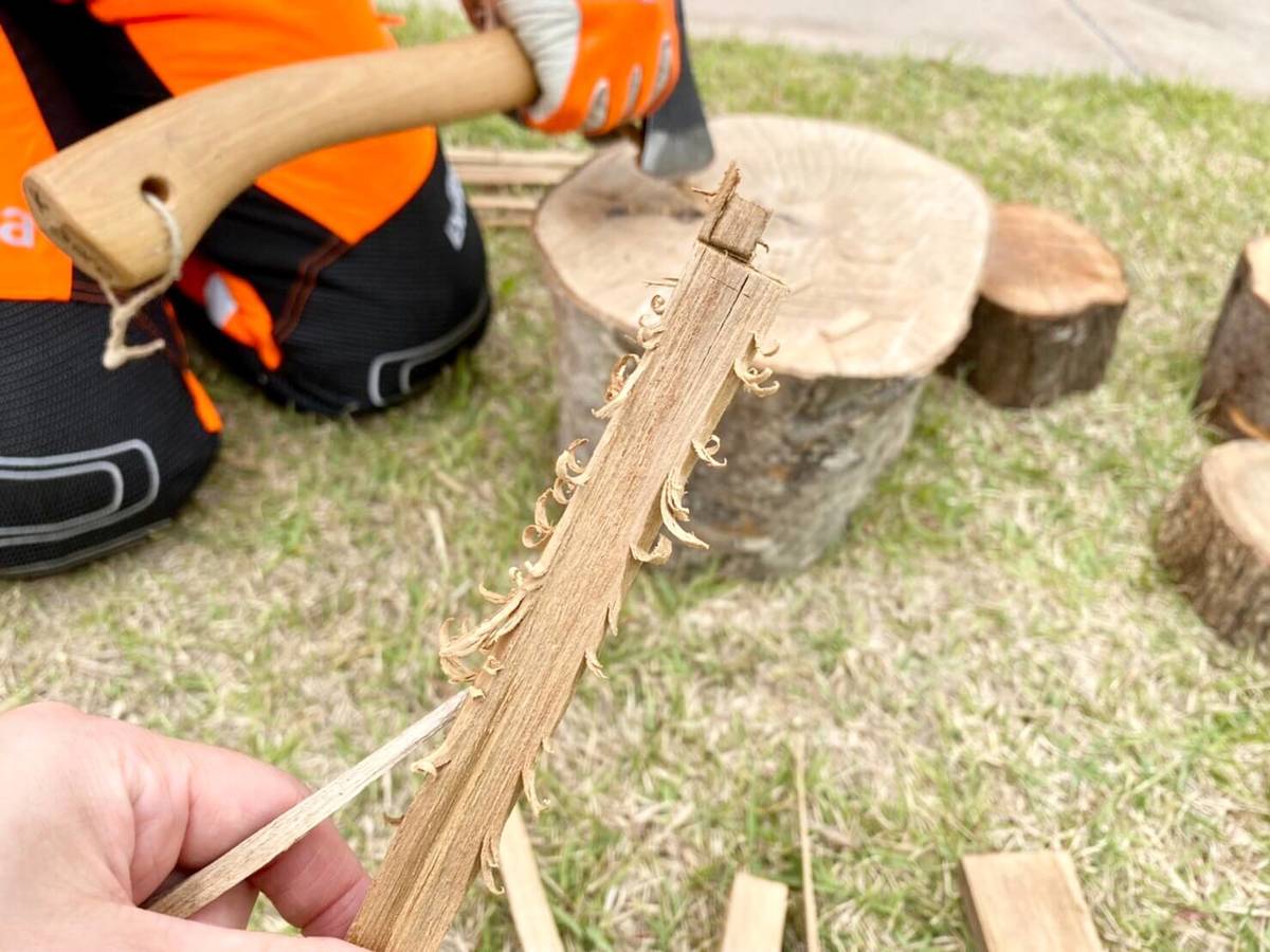 次に細かくした木に切り込みをいれた「フェザースティック」を作っていきます。フェザースティックがあるほうが、より燃えやすくなります。