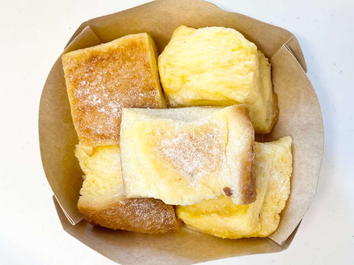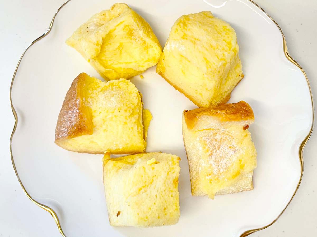 フレンチトーストといえば、温かいトーストにバターがじゅわっと溶けてはちみつやメープルシロップをかけたものをイメージしますが、今回は冷えていてバターなどはありません。