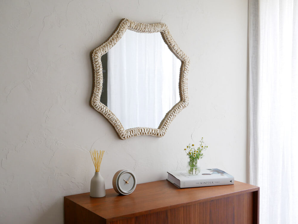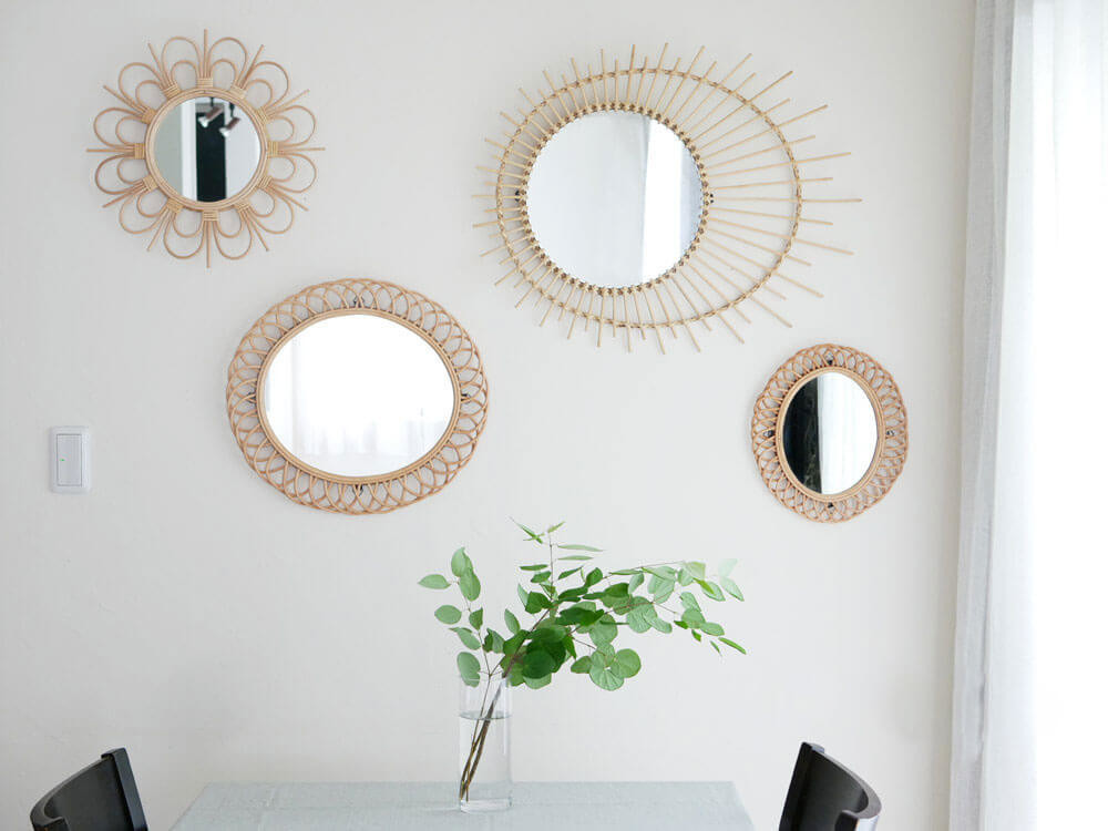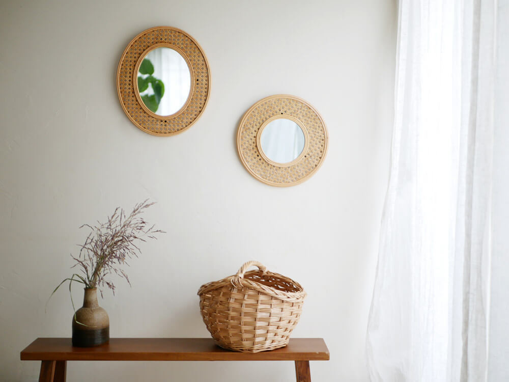 異なる4種類のデザインは、1つ壁に飾るだけでも存在感のあるアイテムですが、大きさ、形の違うラタンミラーを絵を飾るように複数壁に飾ればまた違った雰囲気を楽しめます。