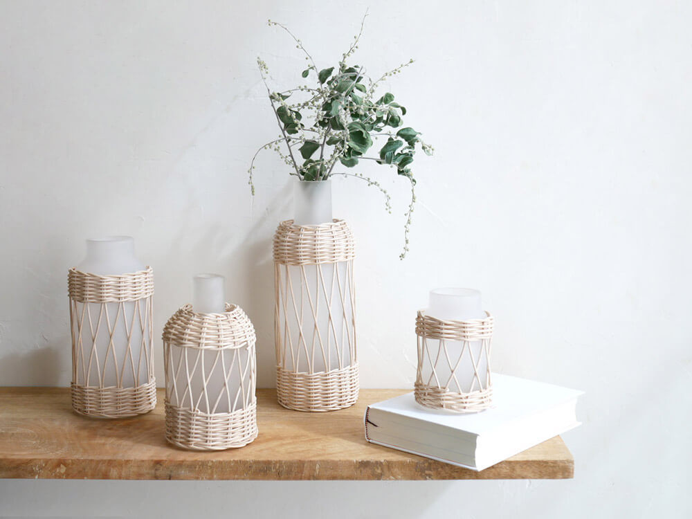 「【POSH LIVING】ラタンフロストベース」は、ガラスの上に手作業でラタンを編み込んだ夏仕様の花瓶。 敢えて霞がかったガラスが清涼感をプラス、そして天然素材が入ることにより、植物をより自然体でありのままの美しさを鑑賞できるんです。