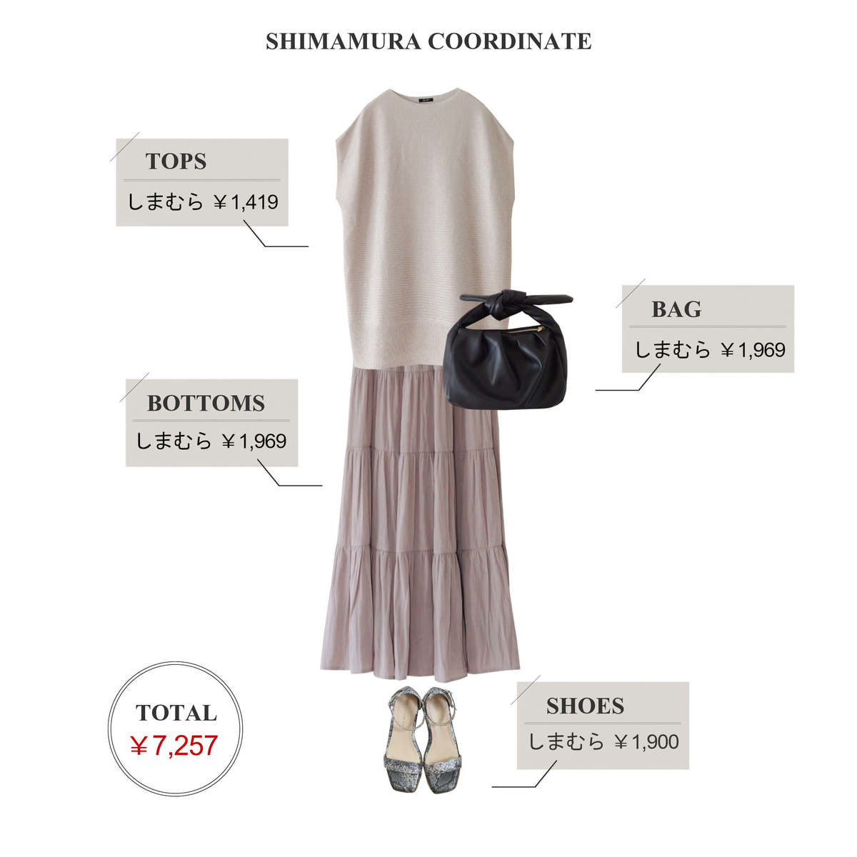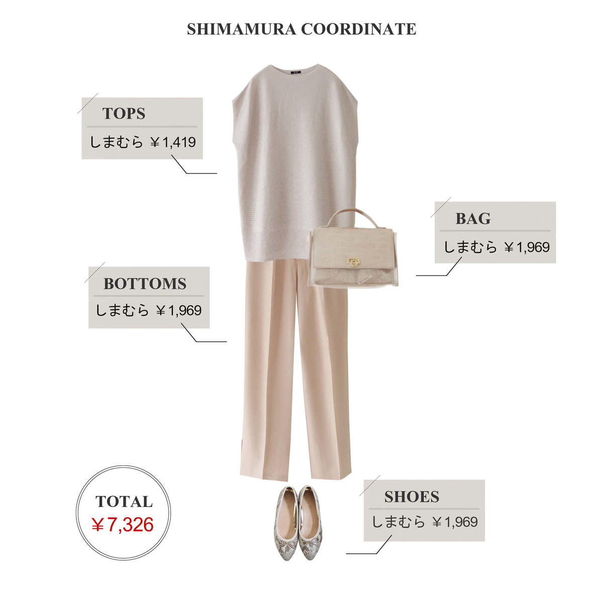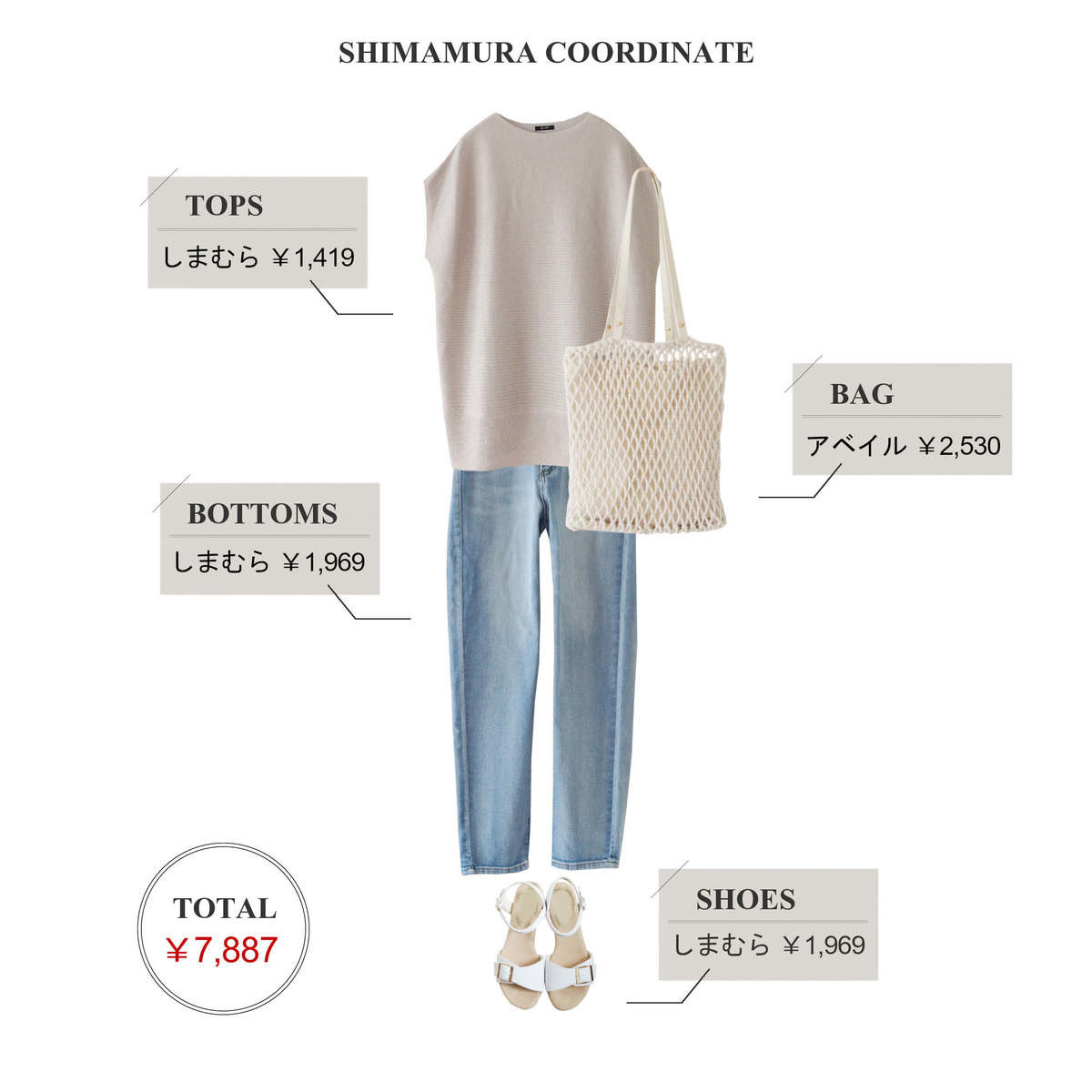 コーデに使用したアイテムは、すべて「しまむら」と系列店「アベイル」のものです。