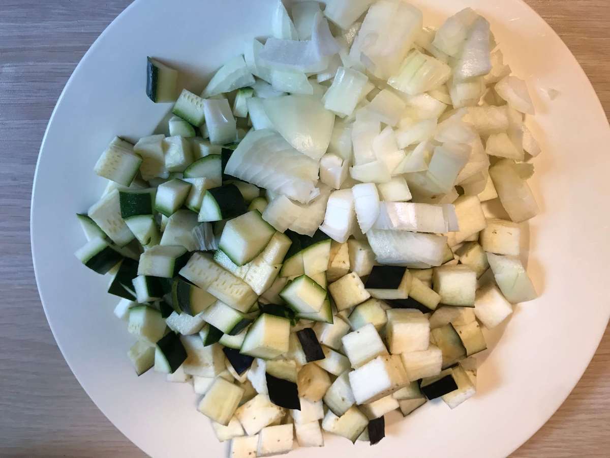 にんにくは皮をむいてから薄切りに、ズッキーニ・茄子・玉ねぎは1.5cm角に切りました。