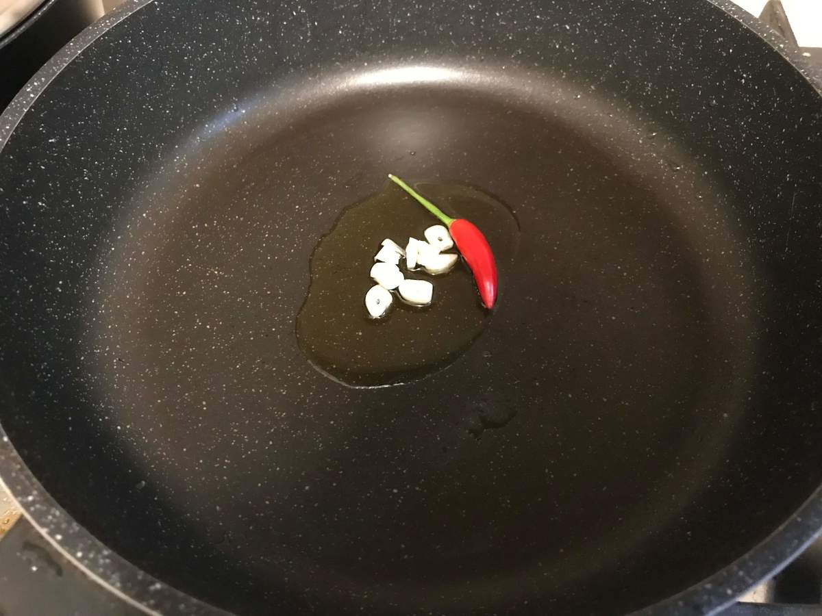 フライパンにオリーブオイルをしき、にんにくと鷹の爪を入れてから、強火で3分炒めましょう。にんにくの良い香りが漂い始めます。