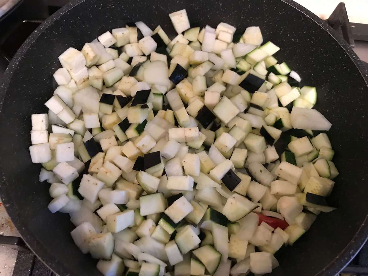 にんにくと鷹の爪の良い香りが立って、チリチリと言う音がしたら、ズッキーニ・茄子・玉ねぎを加えて、さらに中火で5分くらい炒めましょう。