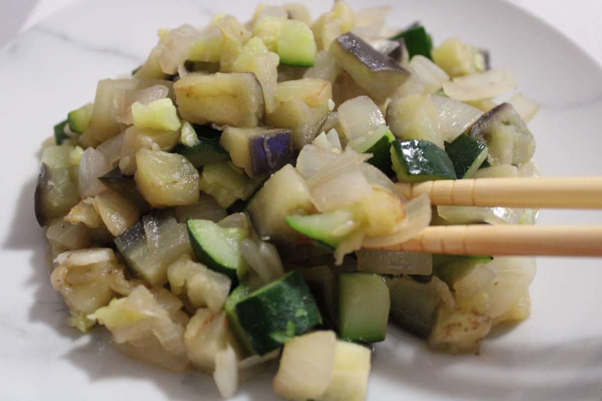 リュウジさんのバズレシピ③ズッキーニ・茄子・玉ねぎを加え、炒め合わせる