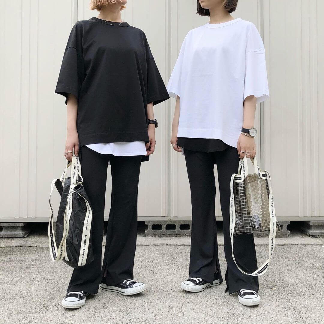 黒Tから白、白Tから黒というモノトーンレイヤードはクール。