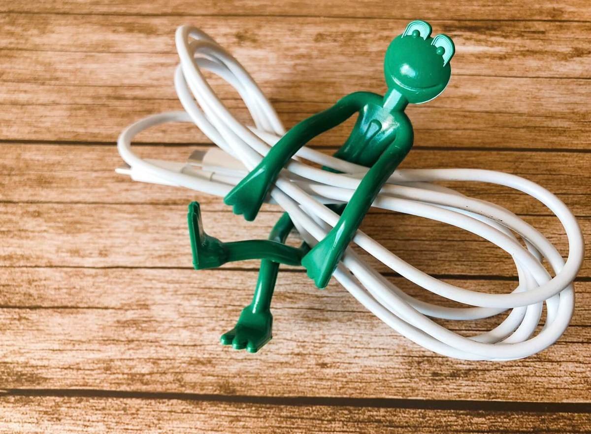 カエルの長い手足や胴体がグニャグニャしていて、自由に形を変えられる結束バンドです。衝動的に買ったので使い方などを一切考えていなかったのですが、実際に使ってみると、これがすごくて!!