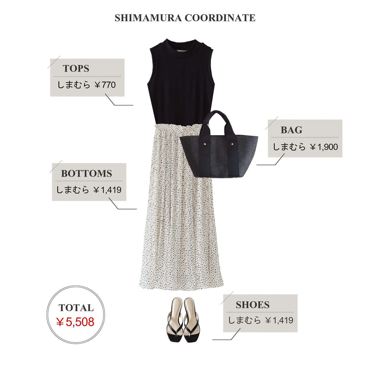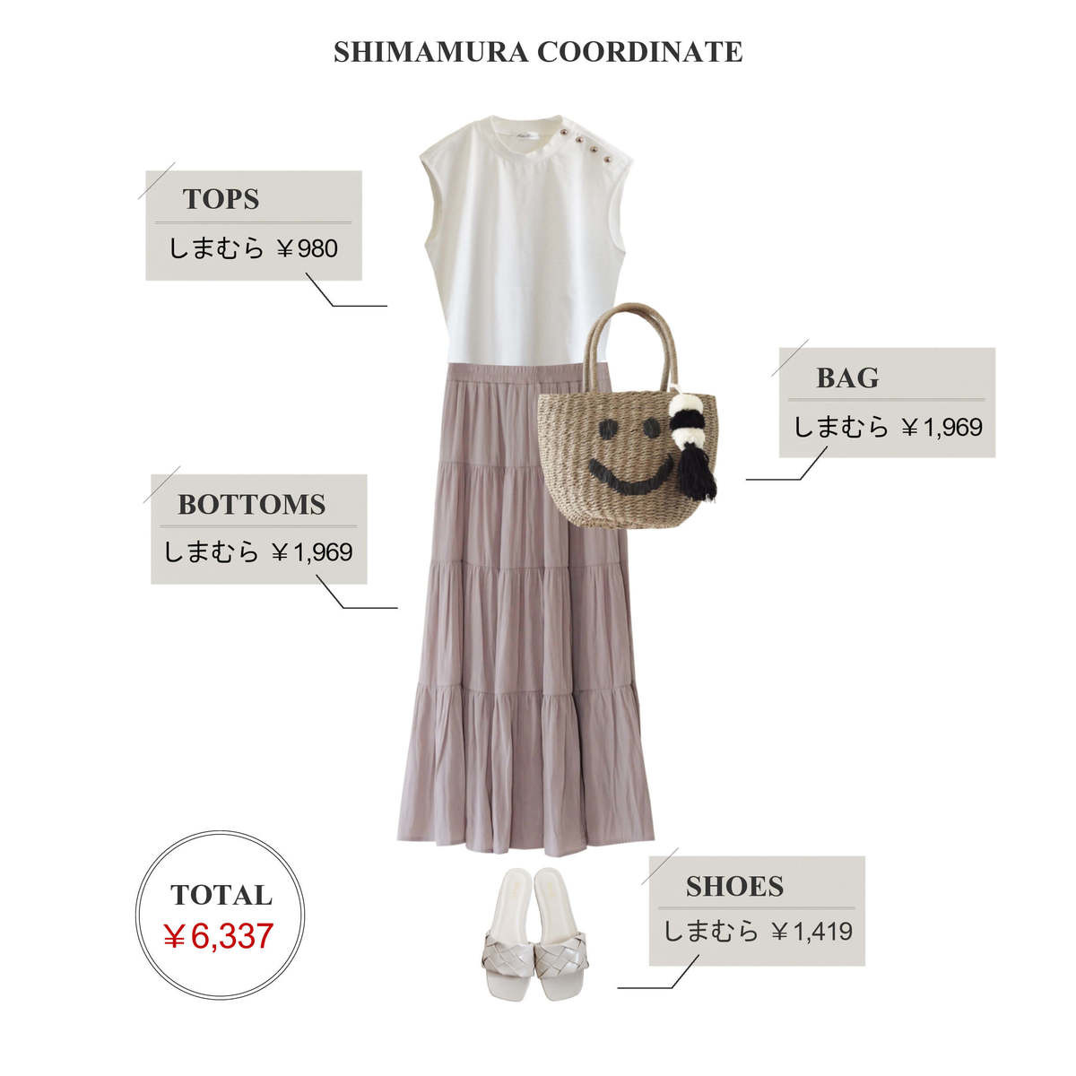 バッグとサンダルは白で揃えて、クリーンな印象に。