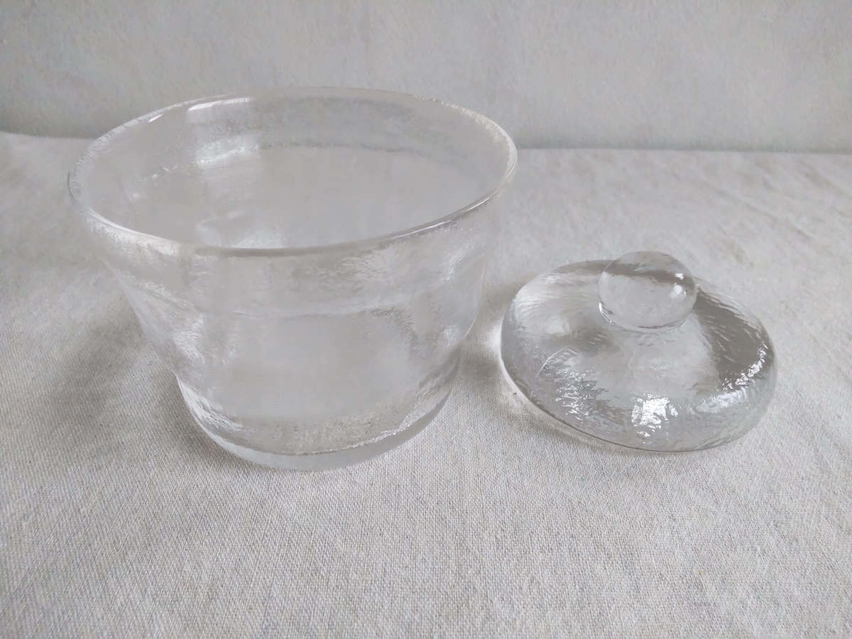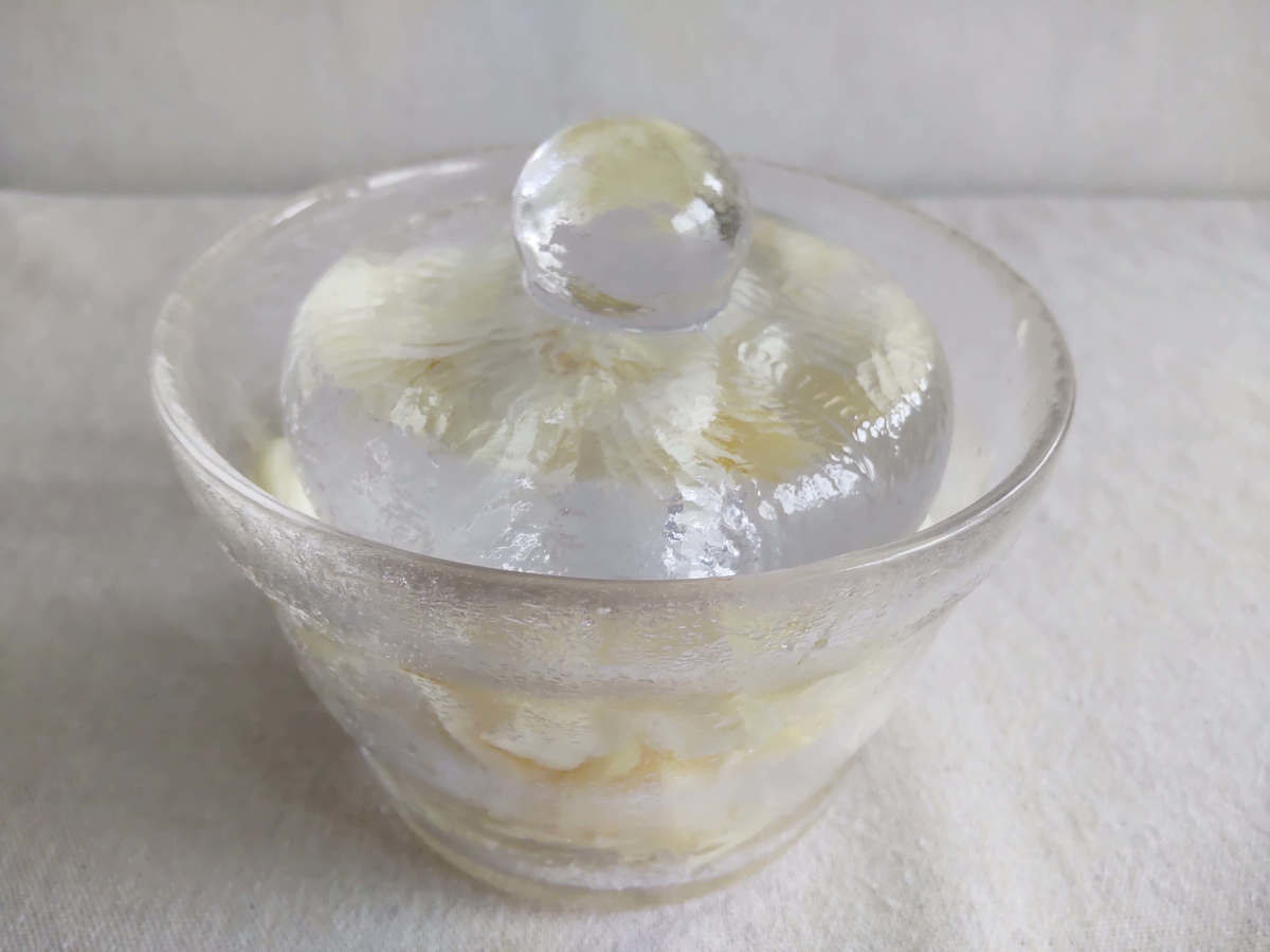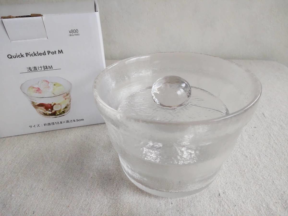 ガラス製の鉢と蓋がセットになっていて、蓋を漬物石として使用する仕組みです。ずっしりと重たく、初めて持ったときは驚愕!