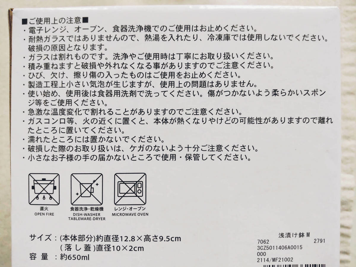 私が購入した「浅漬け鉢」は、Mサイズ。2~3人分の量が作れる大きさです。(以前はSサイズも販売されていましたが、2021年8月4日現在取り扱いがないようです。) とても人気の商品で、オンラインストアでは再販してもすぐに売切れてしまうことが多いです。