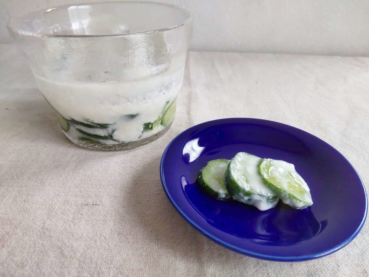 きゅうりを塩もみしたあと、ヨーグルト(50g程度)を馴染ませ、漬け込みます。ヨーグルトは無糖タイプを使用してください。
