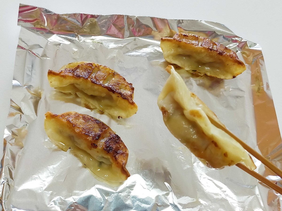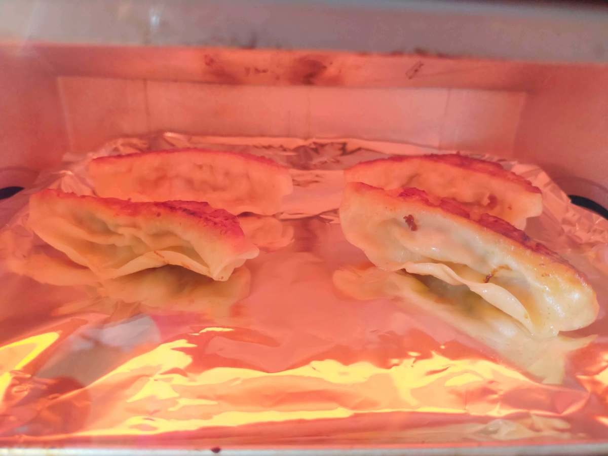 アルミホイルの上に餃子を並べ、焼き目を上にしてオーブントースター(600W)で5分ほど温めます。