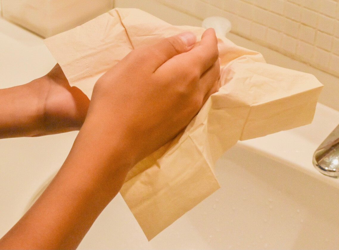 竹の繊維でできたペーパーナプキンは少しのごわつきますが、肌あたりは柔らかく吸水性も抜群。