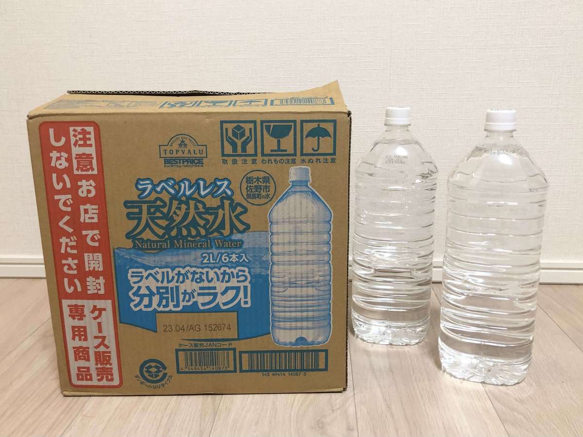 2ℓの水も、各社から販売されています。箱買いできるものがほとんどで、トップバリュだと6本入りで販売されています。