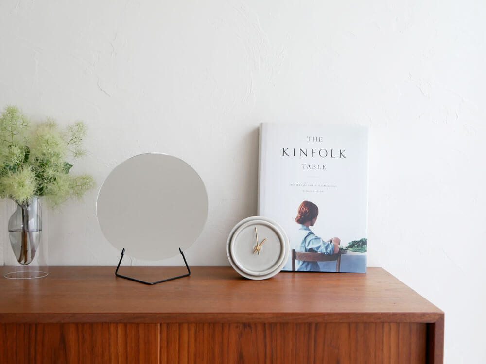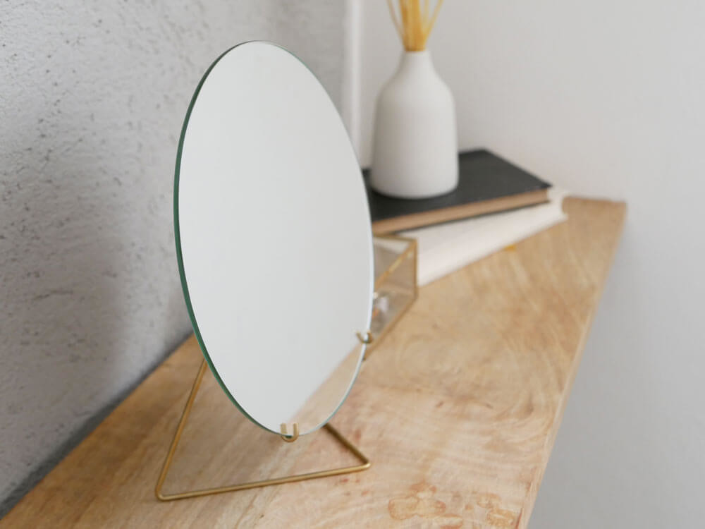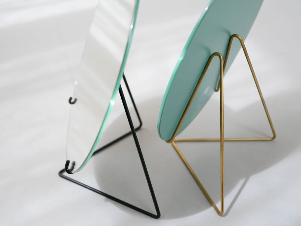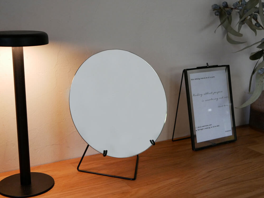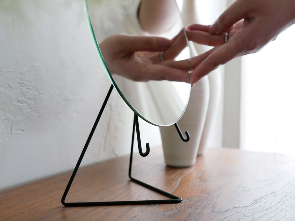 華奢なワイヤースタンドでまるで宙に浮いたかのようなオブジェ的佇まい。 無駄を極限まで省き、景色をただ映すだけなので、当たり前にどこにでも何にでも馴染みますね。 とは言え、角の無い丸型の鏡はどこか柔らかく女性的。枠がないので、現実との境界線がなくどこかファンタジック。