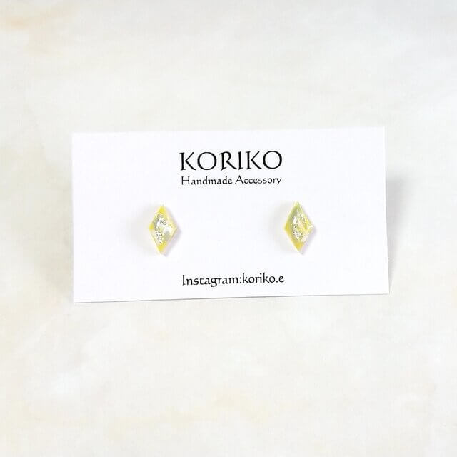 北欧カラーのイエローとグレーの差し色が、さりげなく可愛い「北欧カラーピアス」です。ひし形モチーフは、可愛いだけじゃなくエッジが効いたおしゃれな雰囲気ですよ。派手すぎないので、オフィスにもOK!