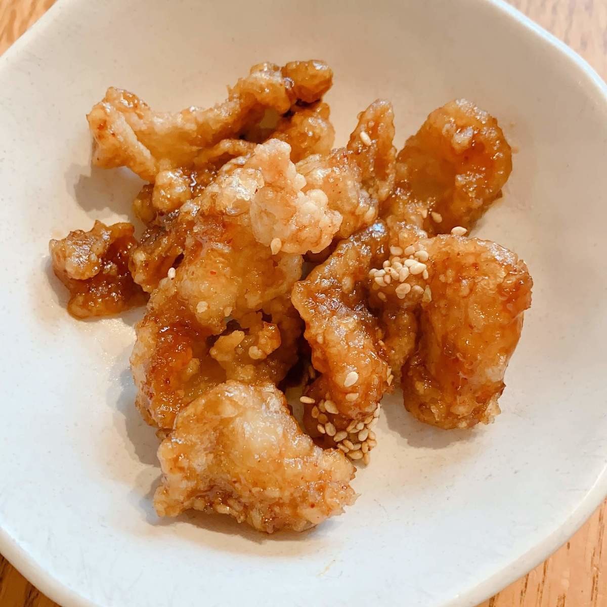 鶏皮がカリカリに揚げられていて、甘辛いタレが絡めてあります。