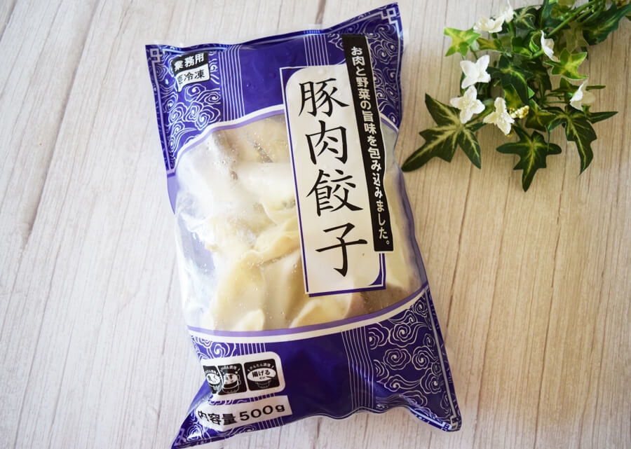 私はなるべく安く作りたいと思いましたので、業務スーパーの冷凍餃子「豚肉餃子」354円(税込)/30個入を使うことにしました。