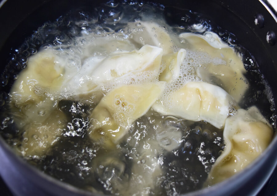 - 沸騰したお湯で冷凍餃子(3個)を4分ゆでる