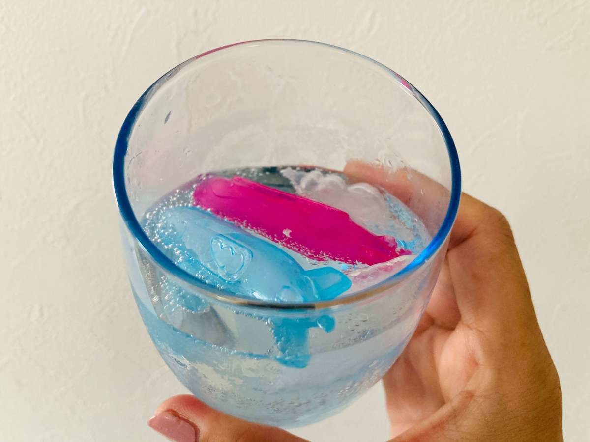 凍らせたアイスキューブを入れてみました。飲み物はあえて常温で準備しましたが、少しずつ冷たくなっていく感じです。5分後にはしっかりと冷たい!飲むときもカラフルで、楽しい気分になれました。