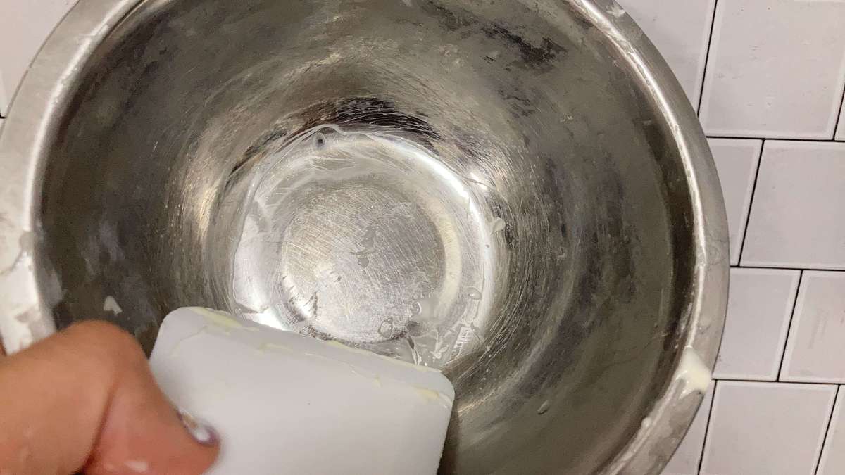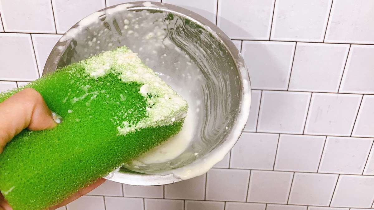 スクレーパーをシュシュと軽くかけただけでこんなに綺麗になりました。この一手間を行うだけで、スポンジが汚れるストレスからから解放されるだけでなく使う水や洗剤の量が劇的に減りました!たった110円のコストでこのパフォーマンスは素晴らしいの一言です。