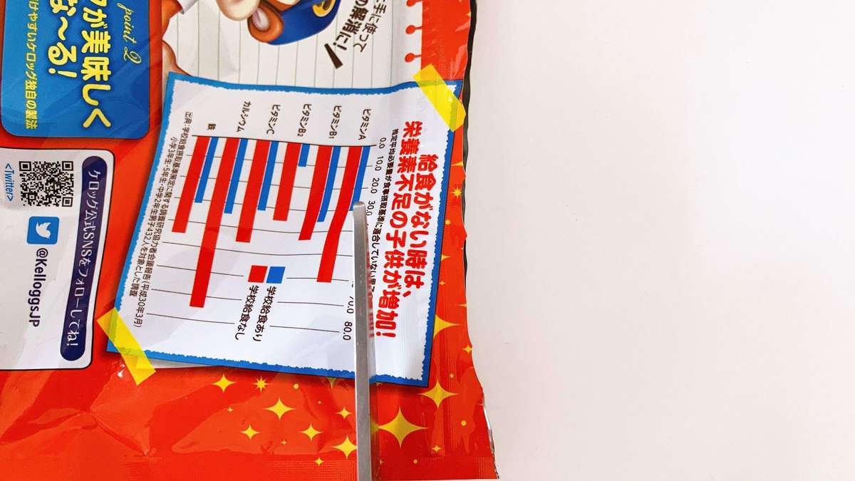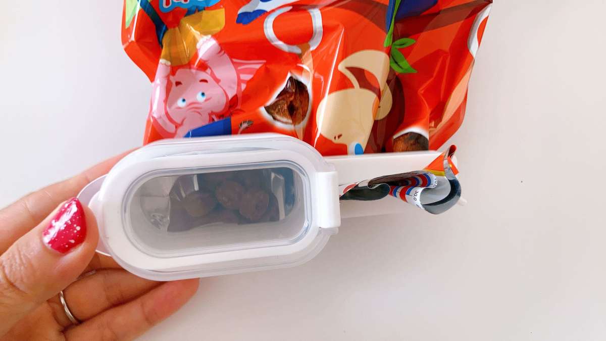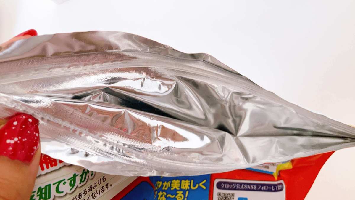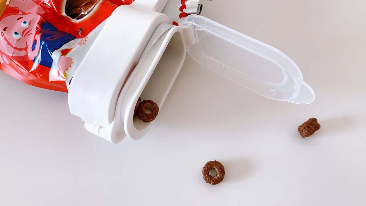開けて広げてみるとこんな感じの構造になっています。 かなり高い確率でジッパーがついていて、私がよくこぼすシリアルの袋にこの便利アイテムをつけてみます。