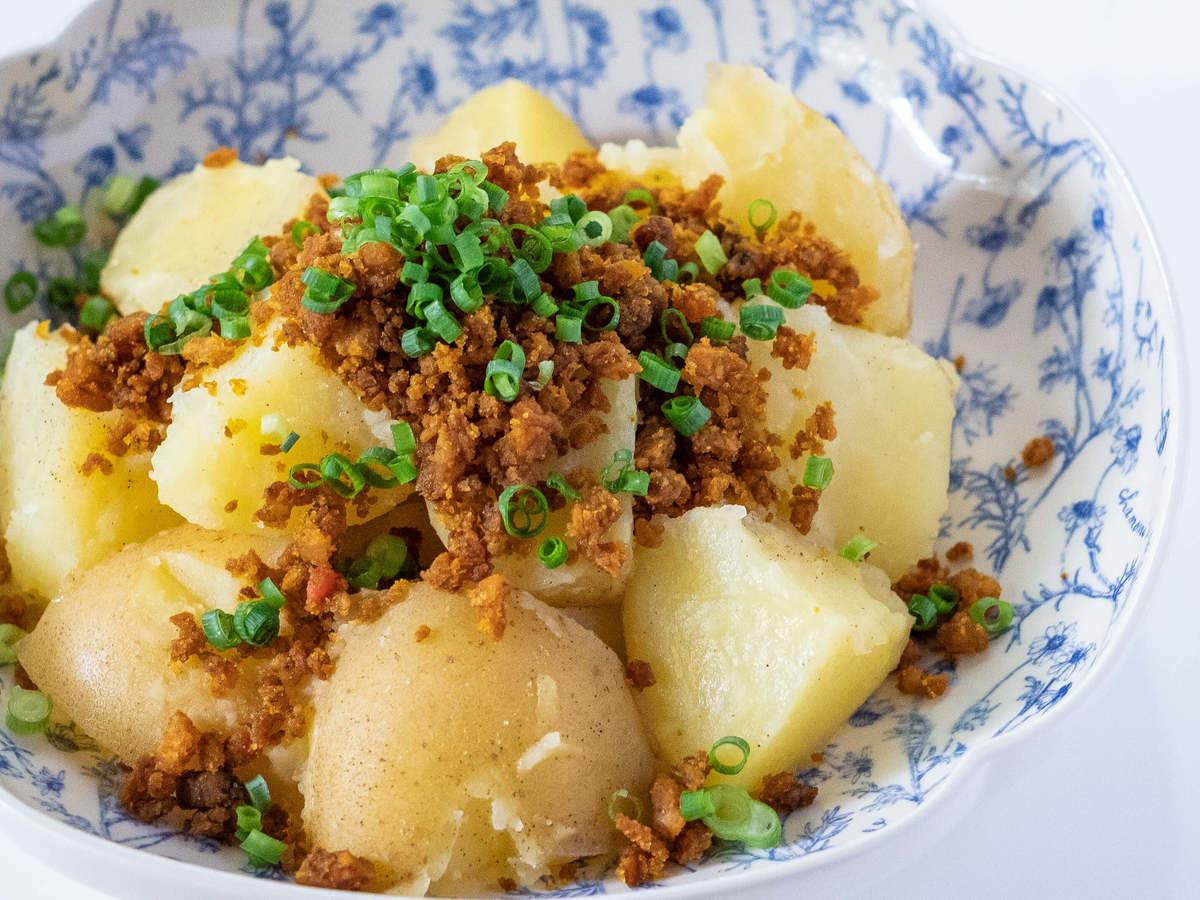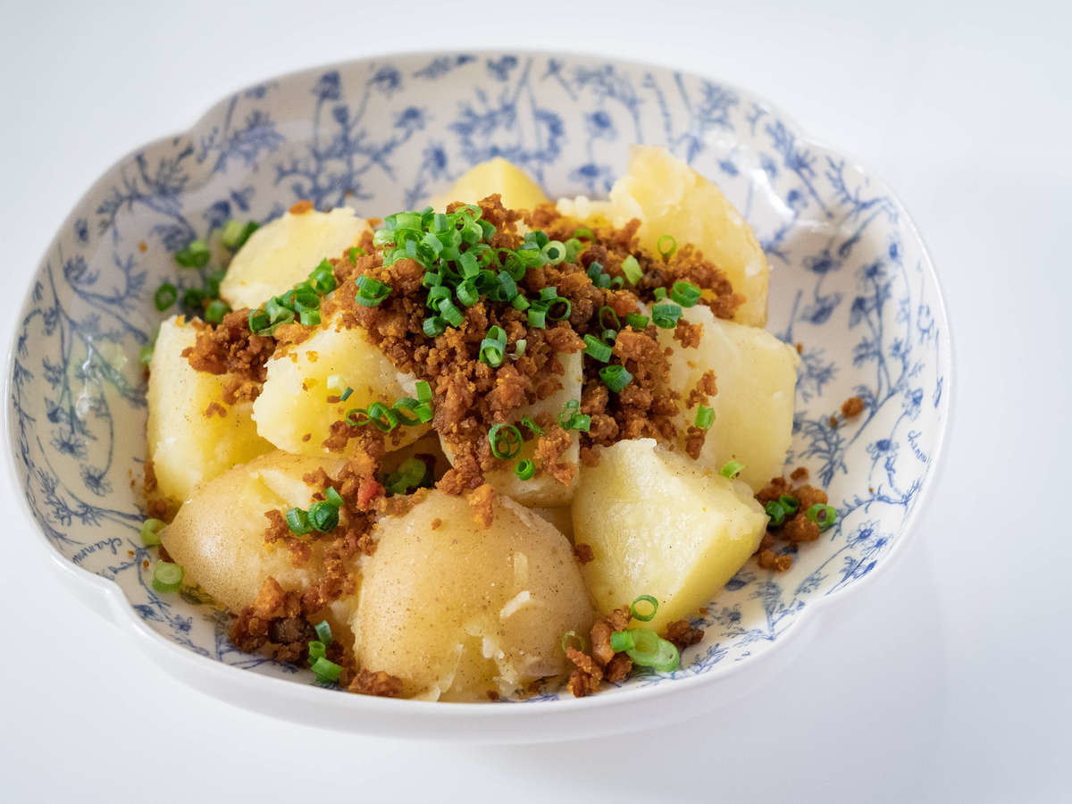 茹でてバターをからめたじゃがいもに、業務スーパーの「畑のお肉のカレーそぼろ」をたっぷりとかけていただいてみました。