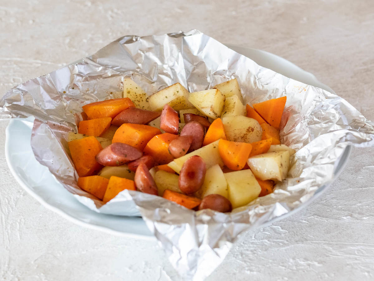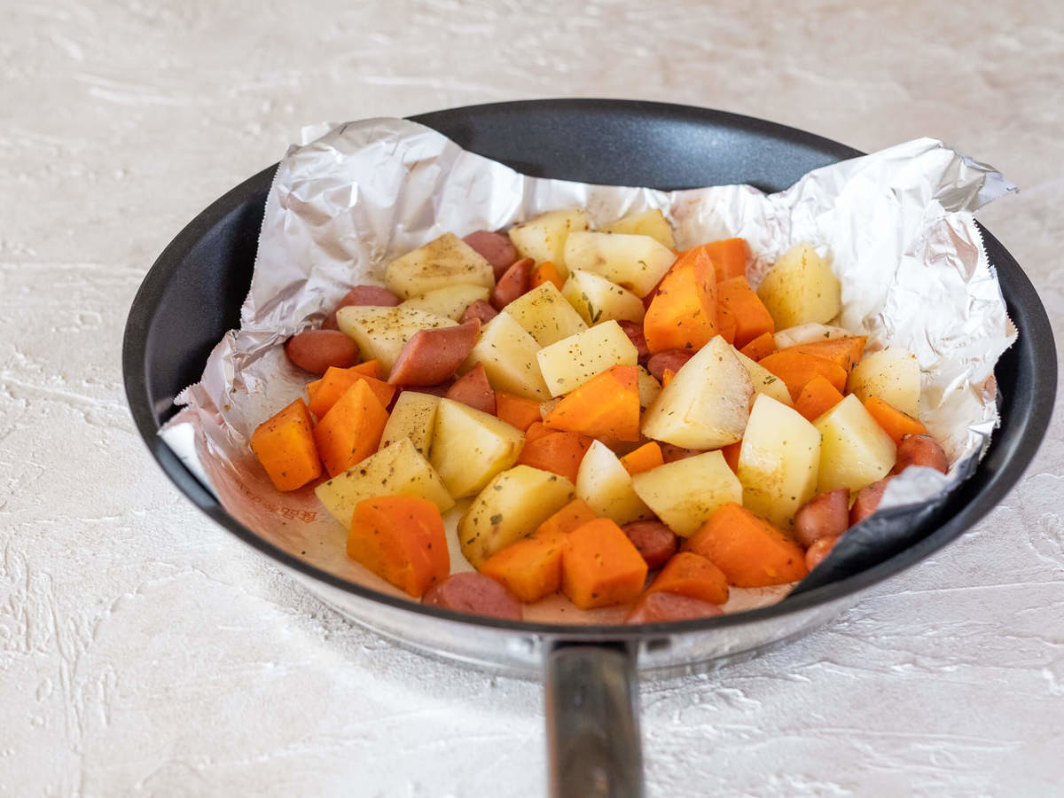 軽く茹でたじゃがいもとにんじん、カットしたウインナーを「フライパン用アルミホイル」の上にのせ、フライパンを加熱して炒めました。